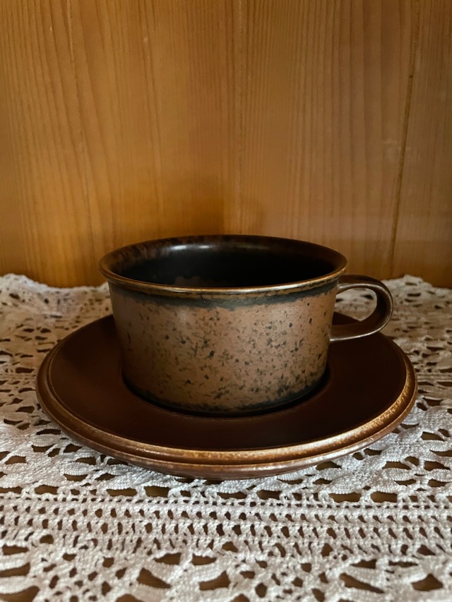 フィンランドの名窯 Arabia(アラビア) が1960〜1999年に製造した人気シリーズ「Ruska(ルスカ)」のカップ&ソーサーです。 「Ruska」はフィンランド語で「紅葉」を意味し、秋の森を思わせる深いブラウンと黒のグラデーションが魅力です。 フォルムデザインは、Arabiaを代表するデザイナー Ulla Procopé(ウラ・プロコッペ) が手がけました。耐久性の高いストーンウェア製で、表面の釉薬は一点ごとに異なる表情を見せ、まるで自然の風景を閉じ込めたような温もりを感じられます。 マットな質感と落ち着いた色味は、コーヒーや紅茶はもちろん、ハーブティーやカフェオレなどにもよく合います。和洋どちらの食卓にも馴染み、使うたびに心を落ち着けてくれる存在です。 長く使える丈夫さと、北欧らしいシンプルで機能的なデザインは、日常使いはもちろんコレクションにもぴったりです。 こちらはカップにバックスタンプが残っております。 ◼︎サイズ : (カップ)直径12(持ち手含む)×H5.4cm(持ち手を含まない直径9.8cm) (ソーサー)直径16.3cm ◼︎年代 : 1960〜1999年 ◼︎コンディション: ★★★★☆(Very Good / 美品) ・目立つ傷や汚れがなく、使用感が少ない ・貫入や色あせがほぼなく、ヴィンテージ品として非常に良好な状態 【お買い求めの前に】 当サイトで取り扱っている商品は一般家庭で30~40年前に実際に使用されていたアンティーク品であるため、経年劣化や使用に伴う損傷がございます。目立つような傷や汚れは商品説明欄にてできるだけご説明させていただきますが、説明以外にも小さな傷や汚れがあることもございます。(SHOPPING GUIDEを一読の上、ご購入をお願いいたします。) ◼︎SHOPPING GUIDE https://fikabord.base.shop/p/00001