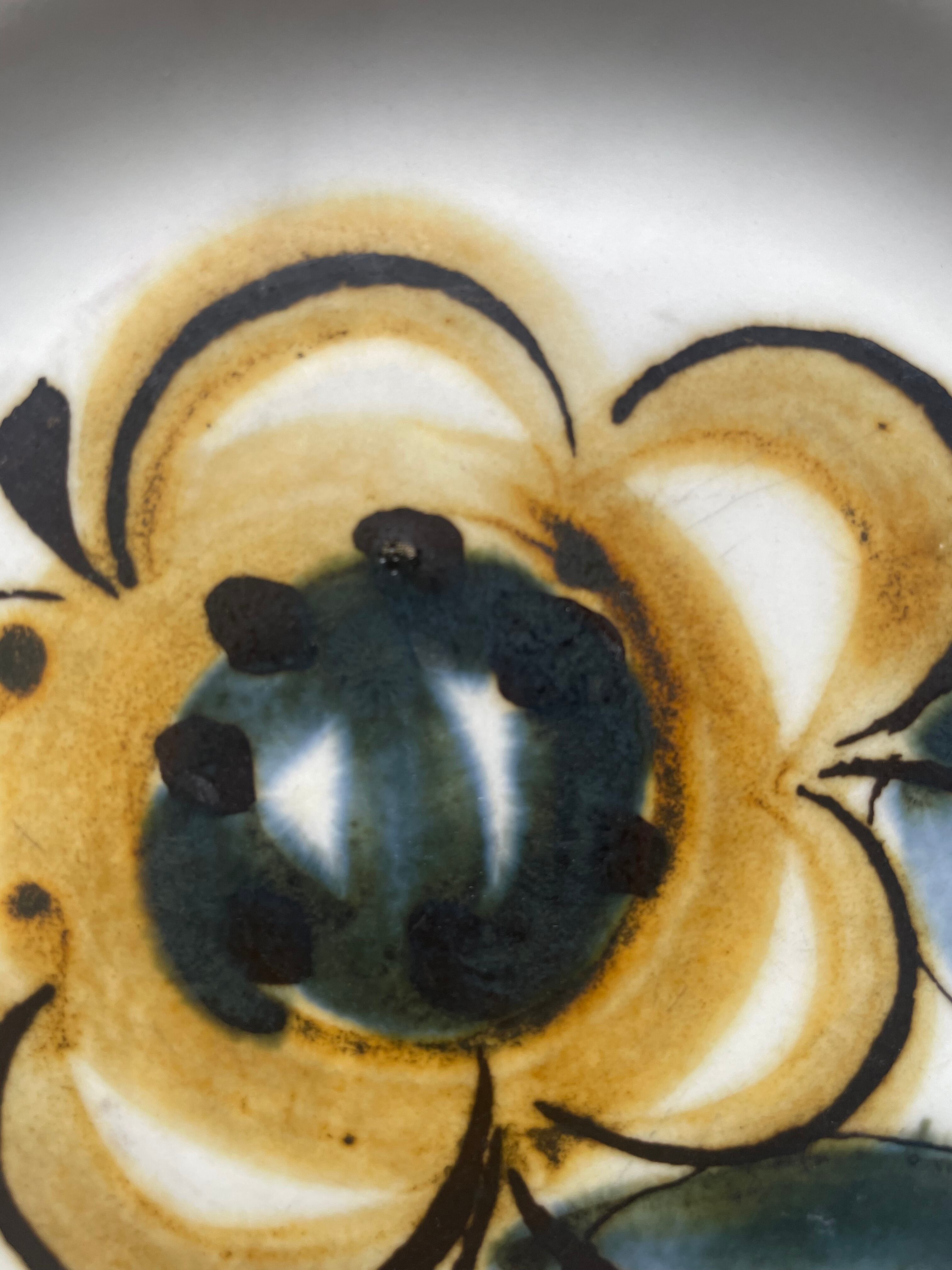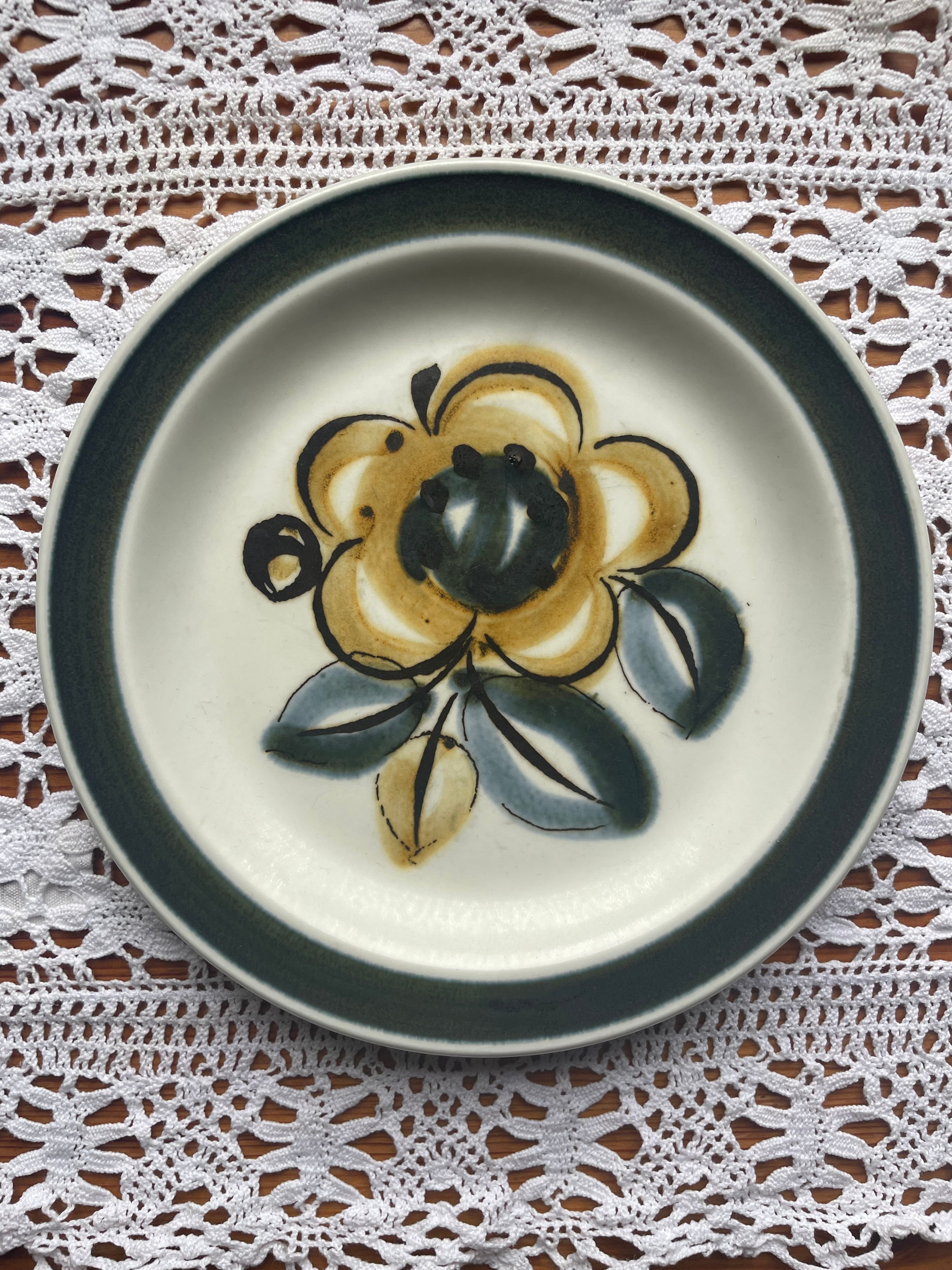 1960年代から1970年代にかけて製造されたこのシリーズは、ハンドペイントで描かれた大ぶりの花模様が特徴で、深いブルーグリーンと黄土色のコントラストが美しく調和しています。