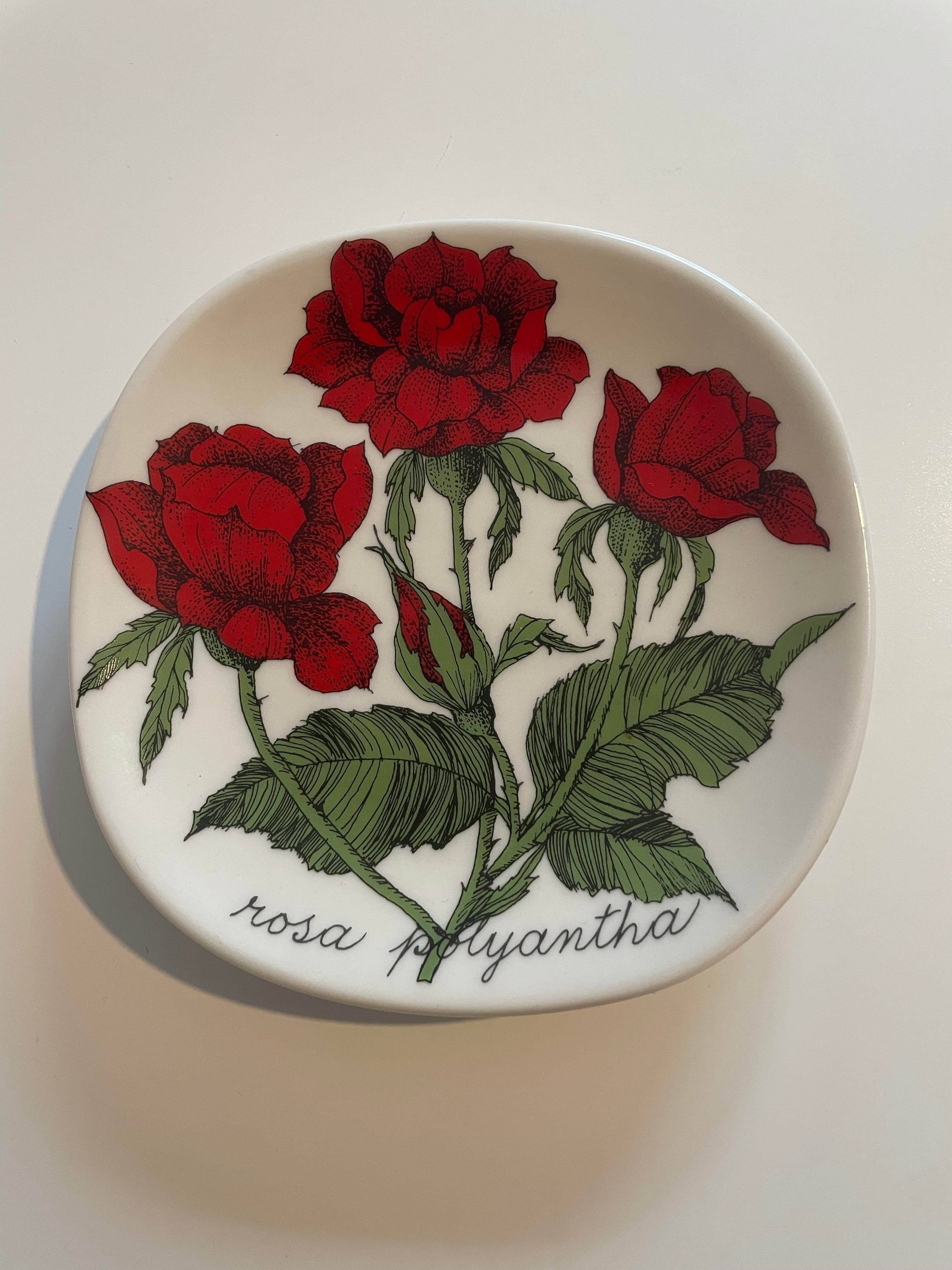 "Rosa Polyantha"(ロサ・ポリアンタ)は、このシリーズの一枚で、小さく可憐なバラの花を咲かせるポリアンサローズが描かれています。